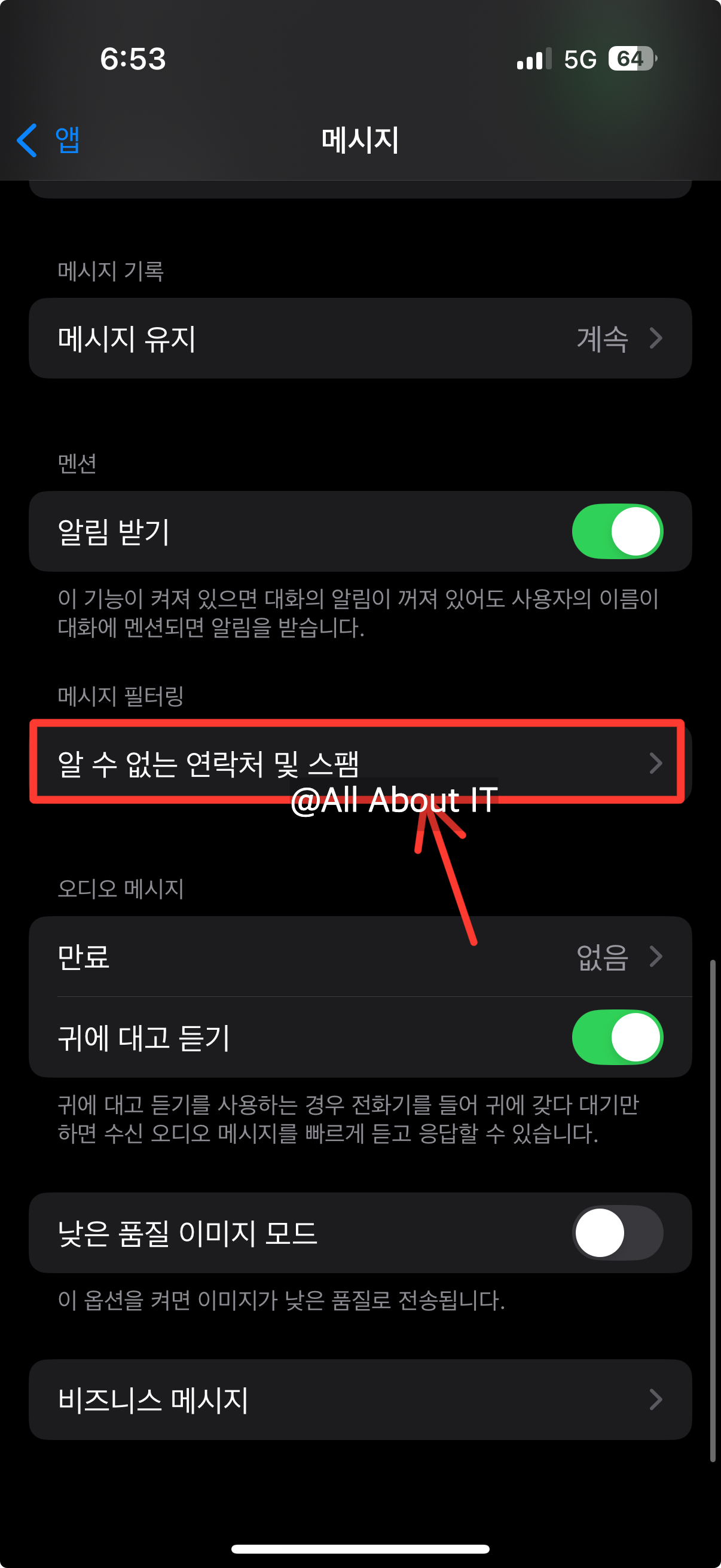 - 알 수 없는 발신자 필터링 활성화: 메시지 설정에서 '알 수 없는 발신자 필터링하기'를 켭니다. 이 기능을 활성화하면 연락처에 저장되지 않은 번호로부터 온 메시지가 별도로 정리됩니다.