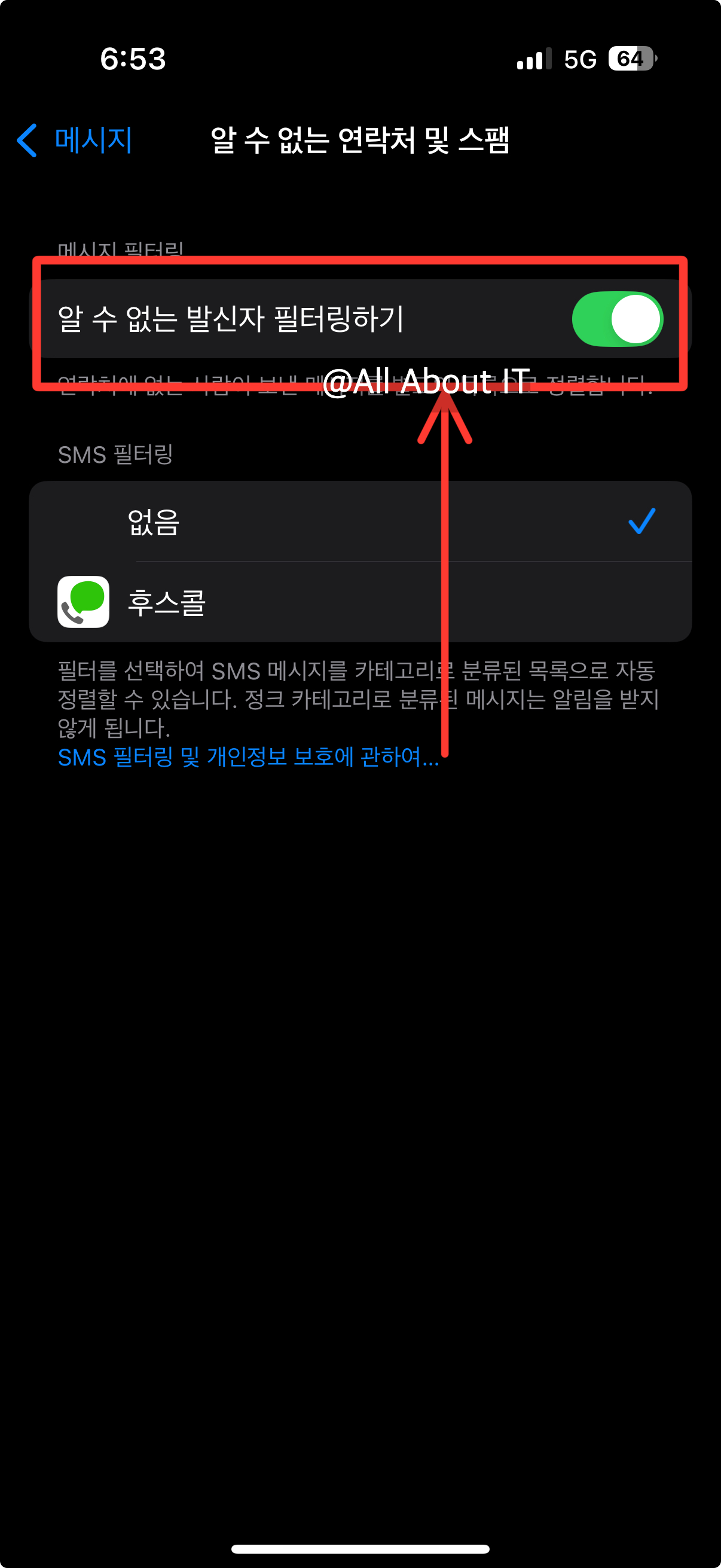- 이후 '메시지'로 이동해 '알 수 없는 발신자 필터링'에서 후후를 선택합니다.