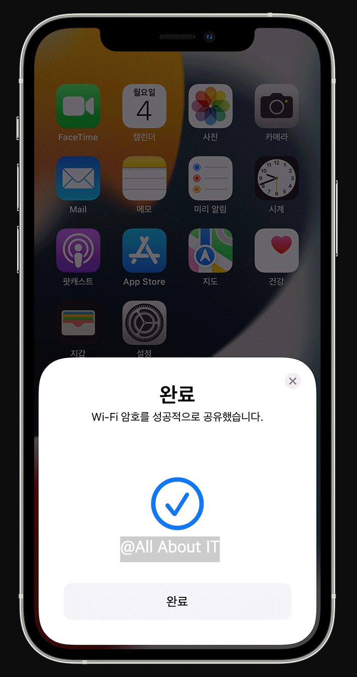 4. 암호 공유 메시지가 뜨면 이를 탭하고 완료 버튼을 누릅니다.