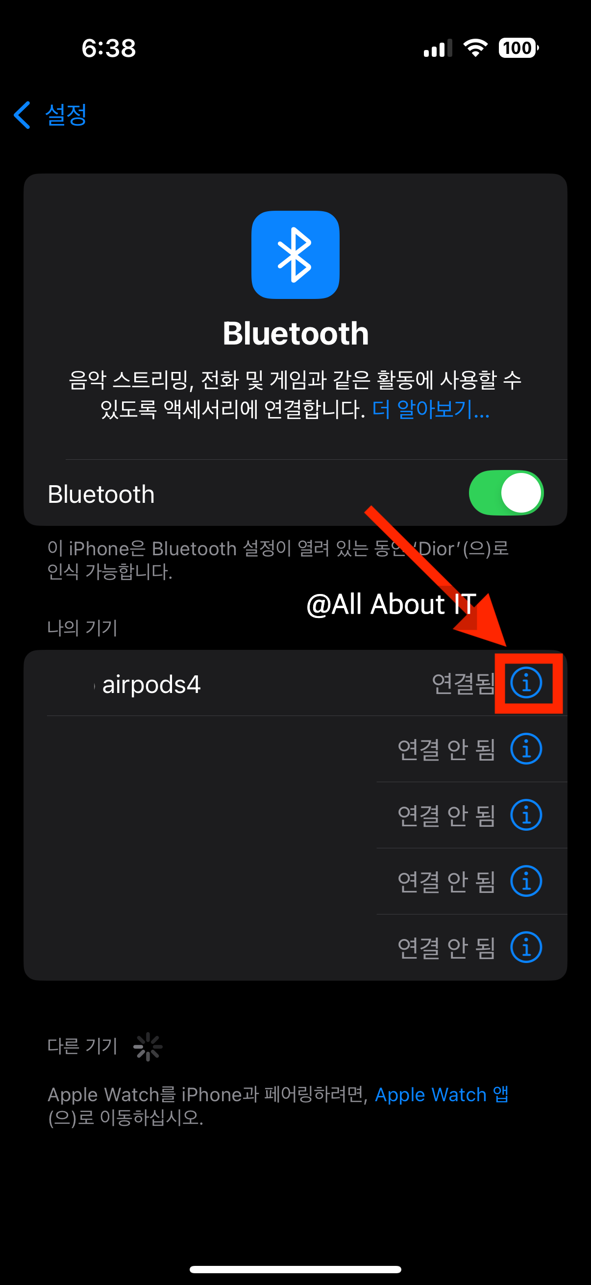 - 2. 설정 메뉴 진입아이폰의 설정 앱을 열어 블루투스를 선택한 후, 연결된 에어팟을 찾아 클릭합니다. 이때 에어팟의 세부 설정 화면이 나타납니다.