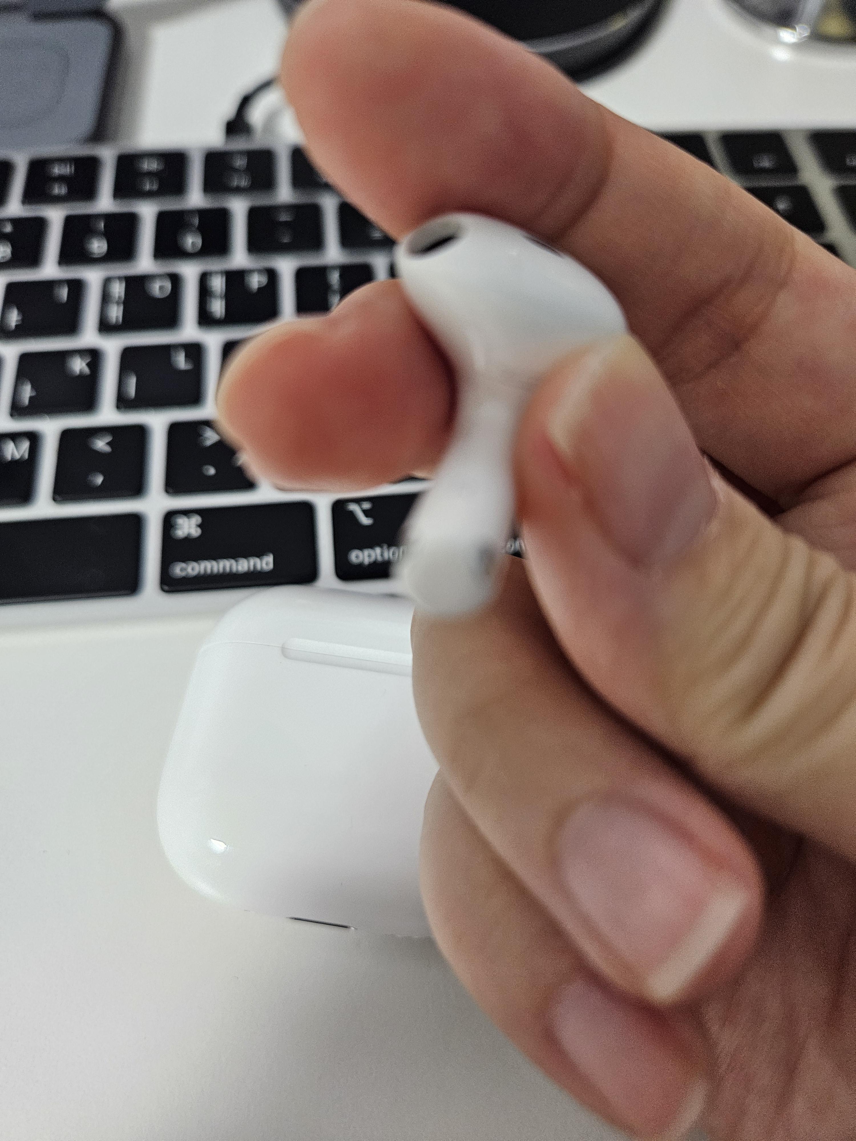 에어팟4는 전작과 비슷해 보이지만, 인체공학적인 디자인이 적용되어 착용감이 훨씬 개선된 것을 느낄 수 있었어요. 오픈형 이어폰을 선호하는 저에게는 무척이나 반가운 변화였습니다. 귀에 부드럽게 착 감기는 느낌이 매력적이었고, 오래 착용해도 큰 불편함 없이 안정감을 주더라고요. 특히 오픈형이면서도 노이즈 캔슬링이 적용되어 있다는 점이 이 제품의 가장 큰 특징인데요, 일반적으로 오픈형 이어폰에서는 기대하기 어려운 점이라 더욱 놀라웠습니다.