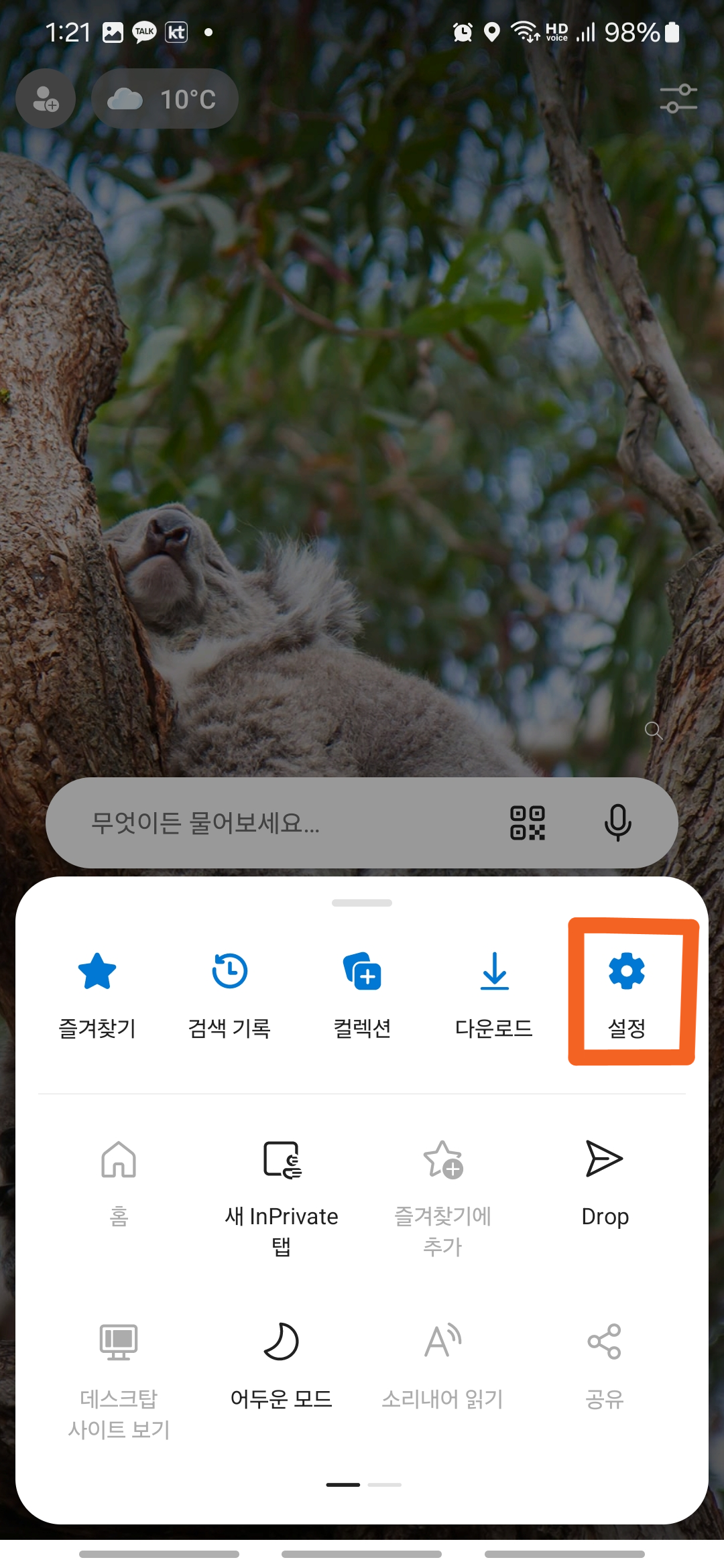 브라우저 우측 상단에 보이는 세 점[...]으로 표시된 더보기 버튼을 클릭해 주세요. 그럼 여러 옵션들이 나타나는데, 여기서 '설정'을 찾아 클릭합니다.