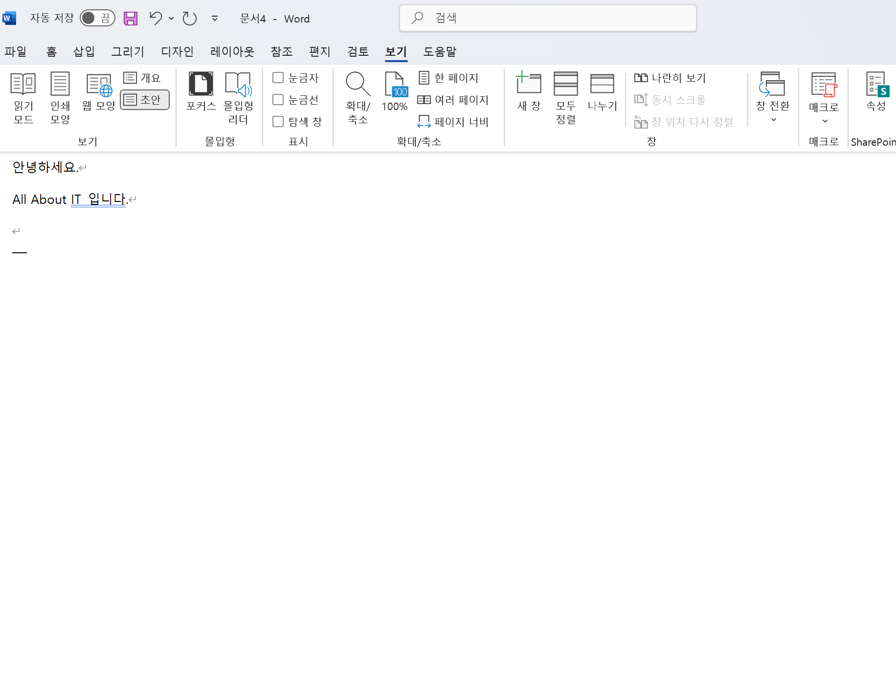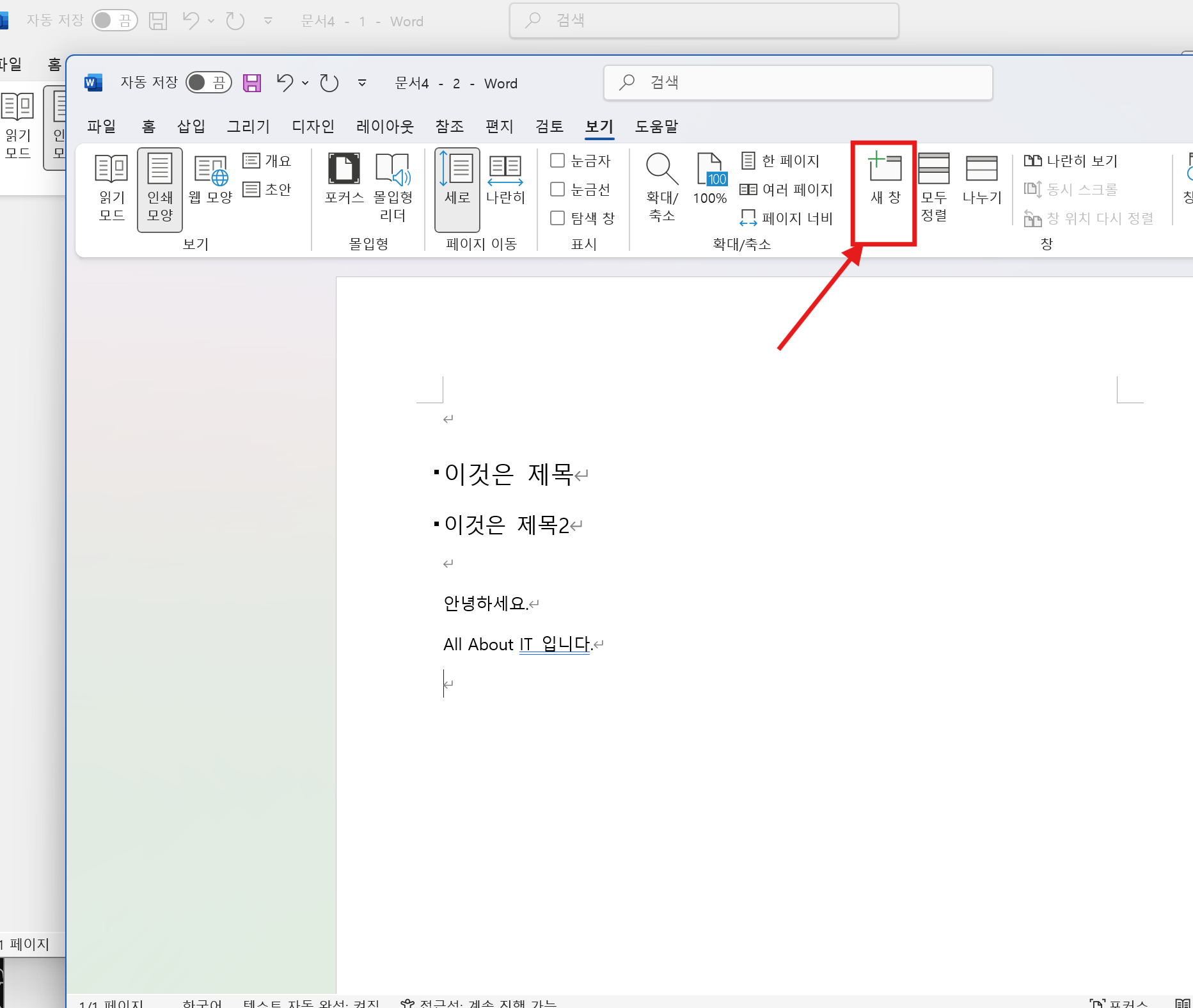 - [보기]-[창]-[새 창] 열기를 하면 새 문서가 1개 더 생김