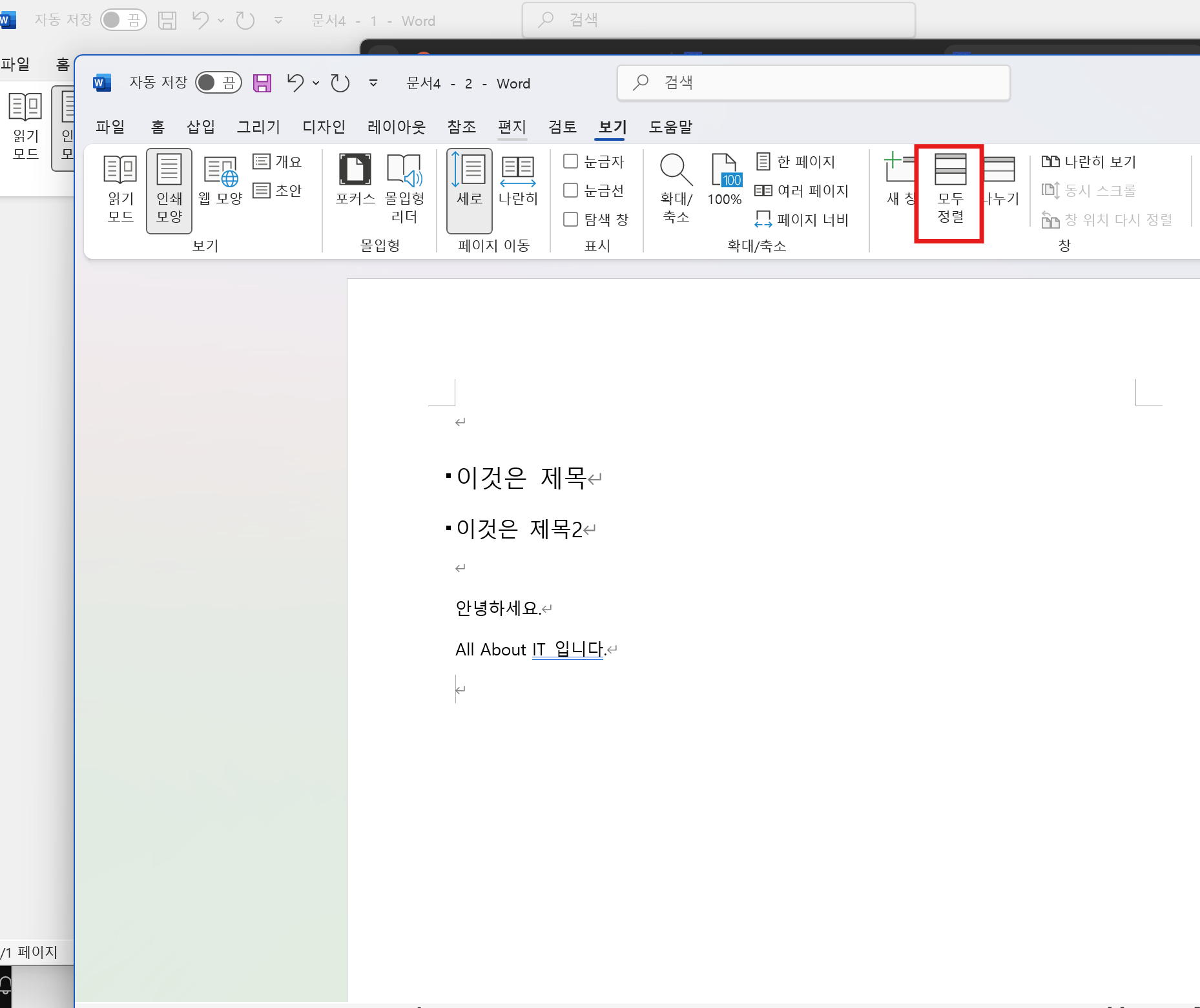 - 여러개 창이 열린 상태에서 [모두 정렬]을 클릭하면 화면에 꽉 차면서 똑같은 균등 분할로 창이 정렬되어짐