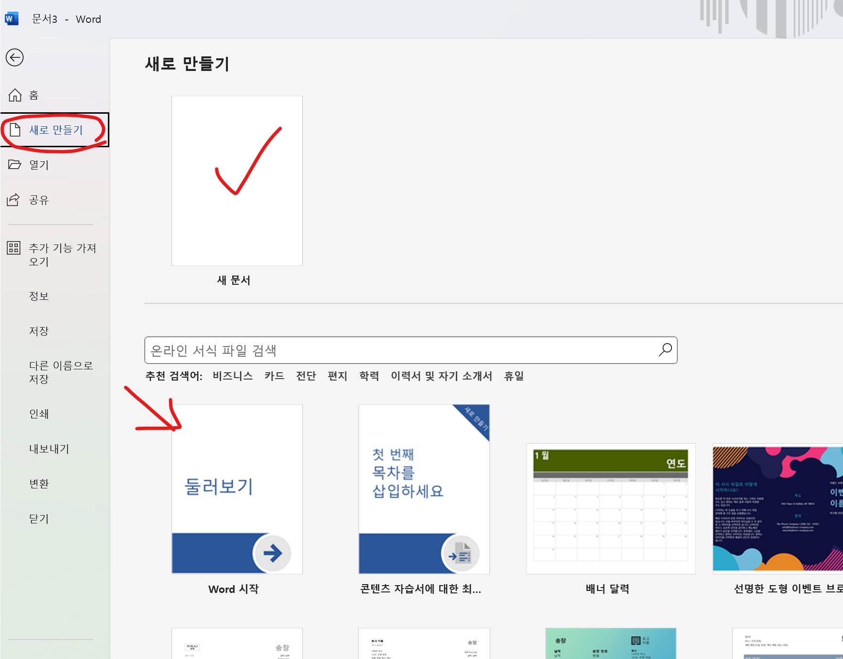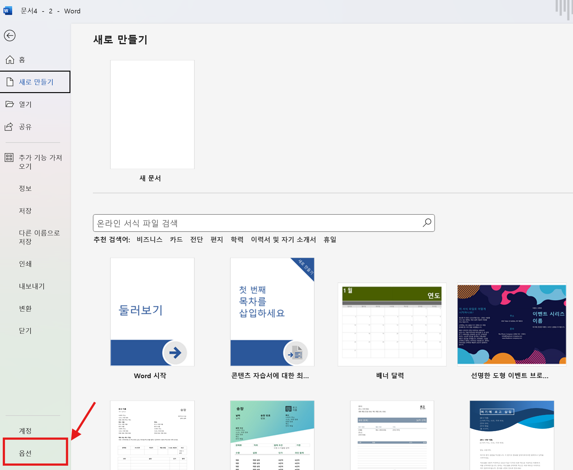 워드에서 문서를 만들려면 새 문서를 만들거나 기존 서식을 활용하여 만들면 된다. 내 경우에는 기존 서식을 활용해 만들어본 적이 거의 없으므로 매일 새문서를 클릭하였다.