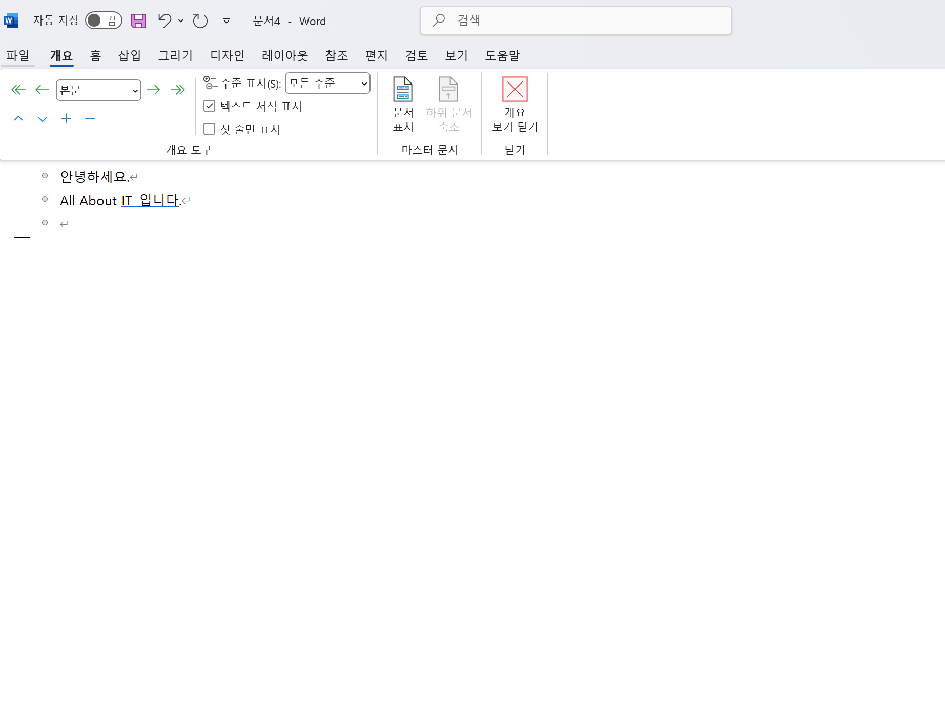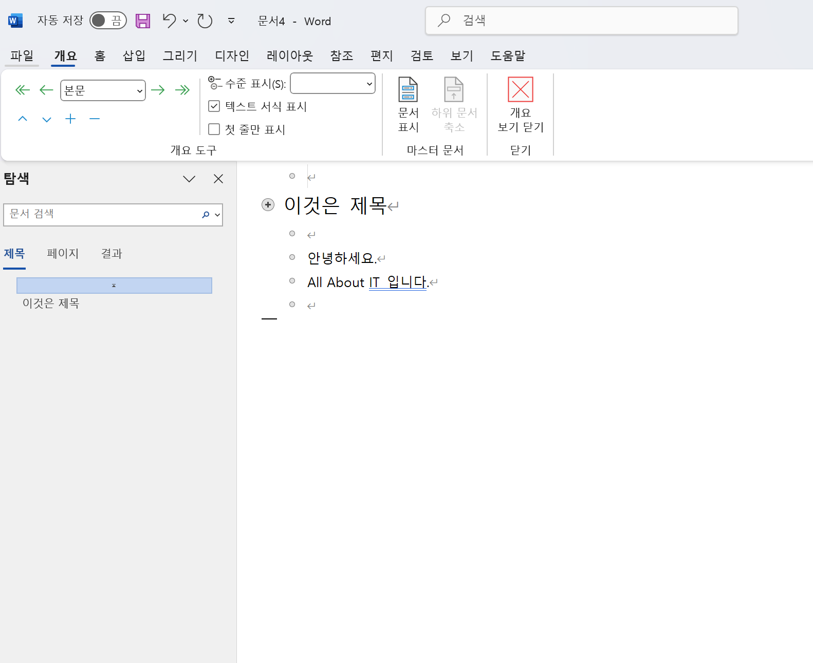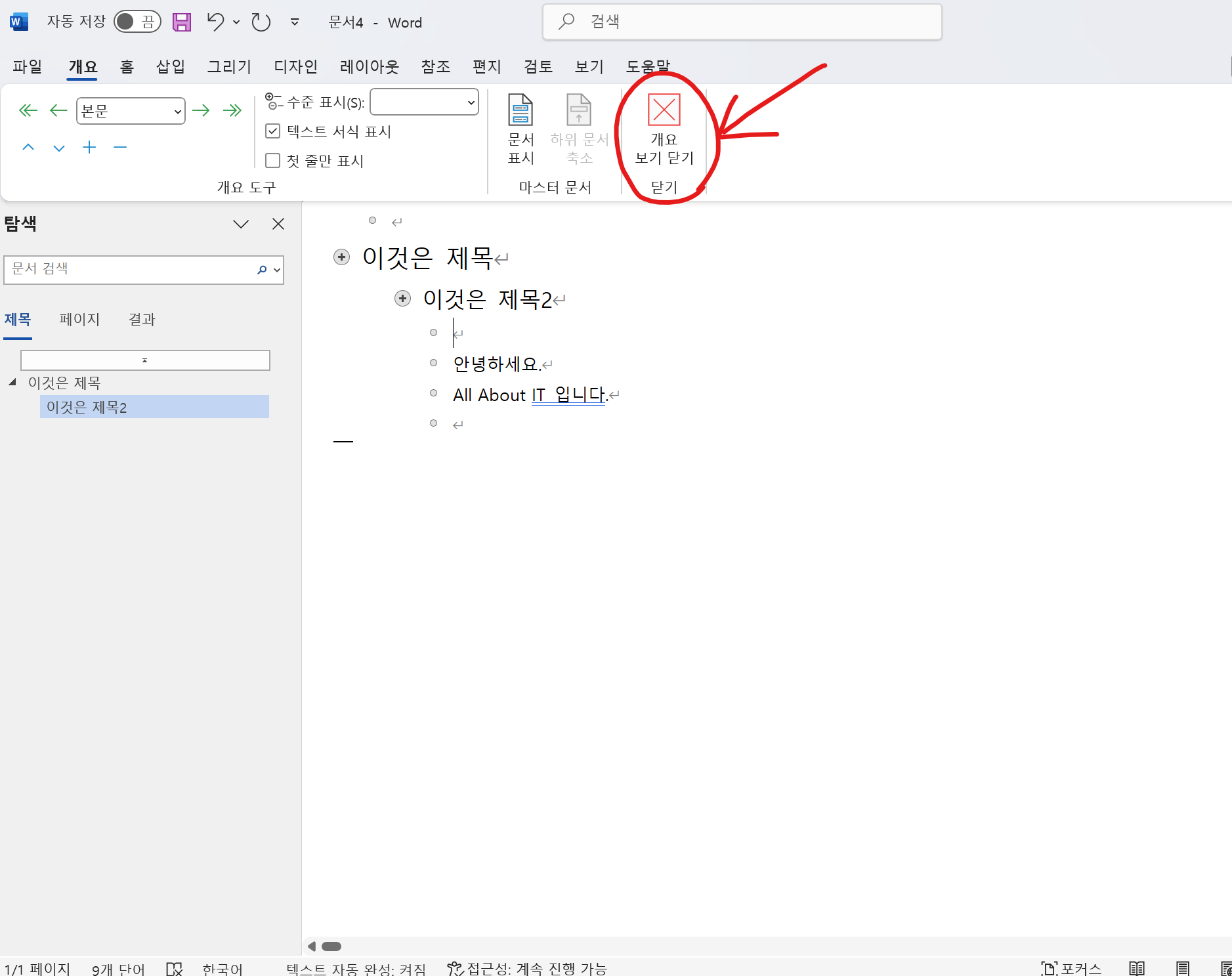 - 개요보기 닫기 : 도구모음에 "개요 보기 닫기" 클릭