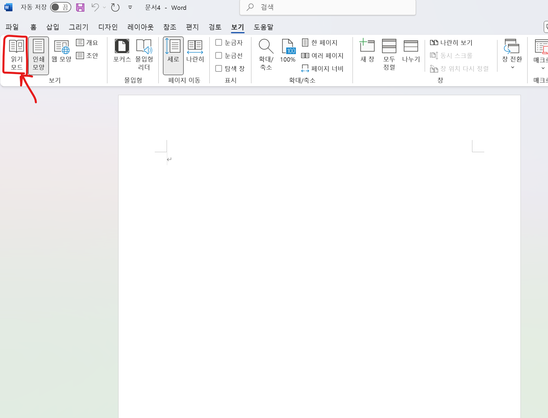 - 읽기모드 : 내용 편집이 안되고 오로지 읽기용으로 볼 때, 다시 워드 화면으로 돌아가려면 우측 하단에 보기 모드 선택 아이콘을 선택한다.