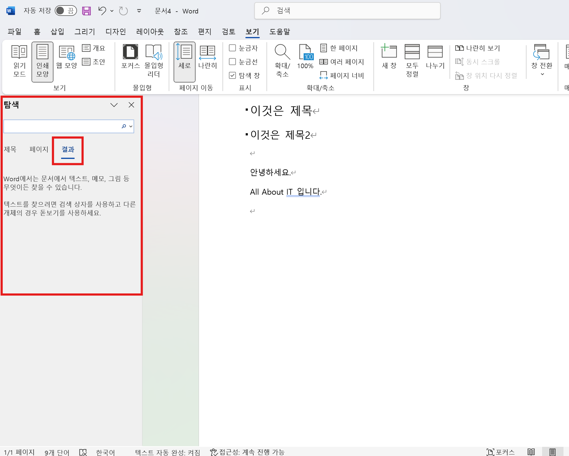 - [탐색]]-[결과] 탭을 클릭으로 여는것과 Ctrl + F단축키를 눌러 탐색의 결과 탭을 열 수 있음, 단축키가 확실히 빠름