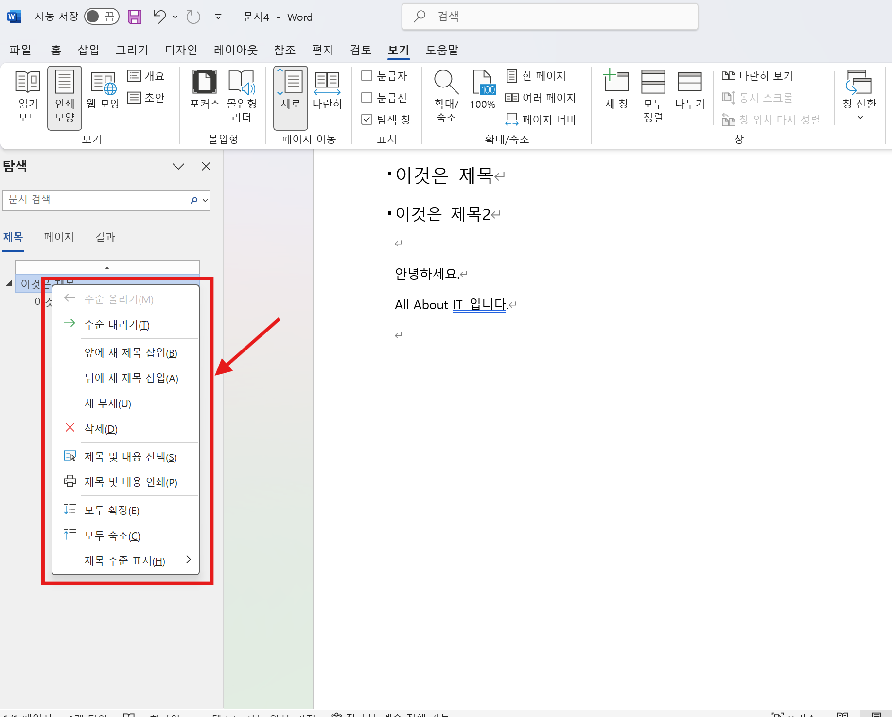 - 개요 변경 : 수준을 올리거나 내리거나 혹은 다른 기능 수행 시 마우스 탐색 창에서 마우스 우클릭하면 메뉴 나타남