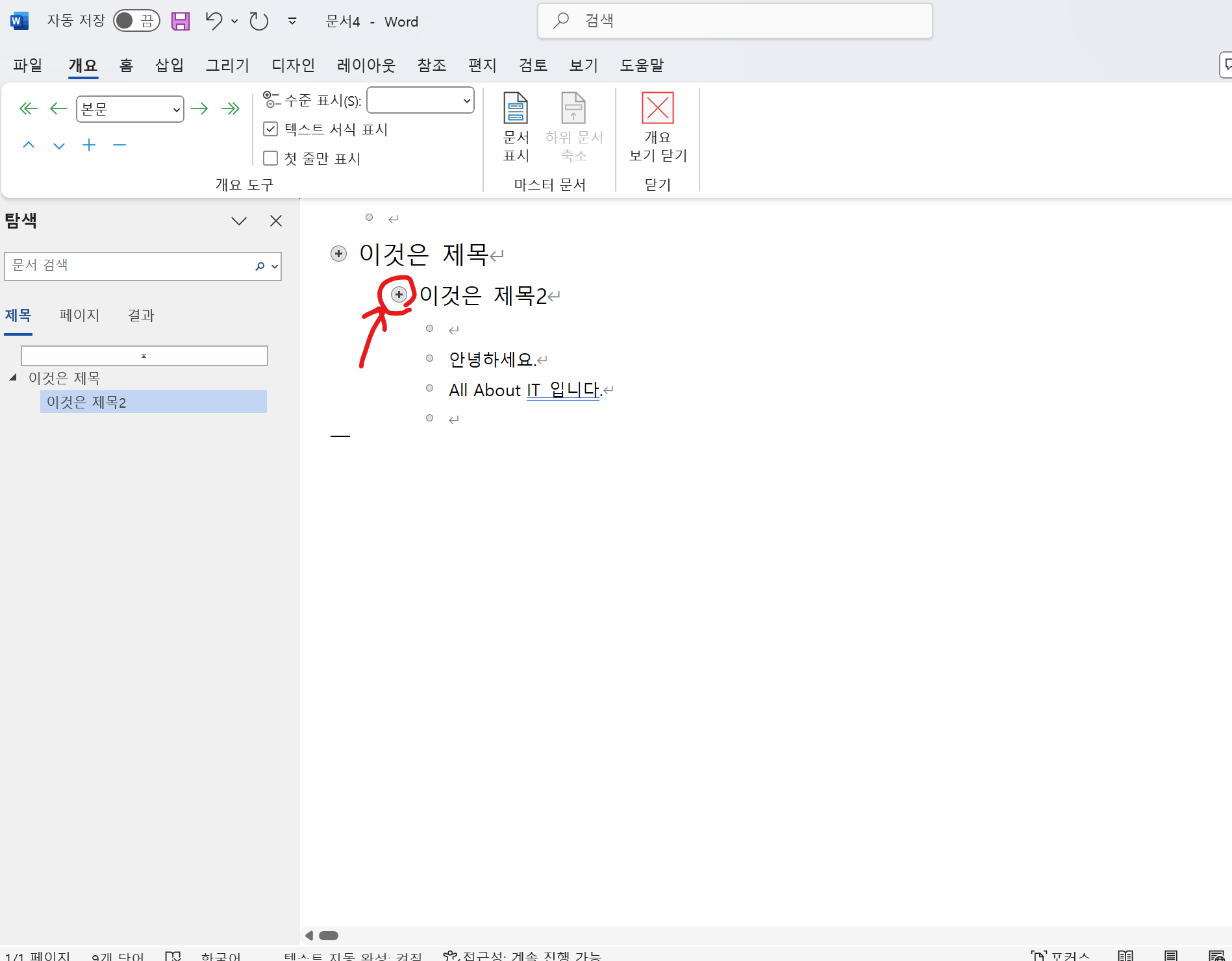 - 하위 수준 표시 : [개요 도구] - + 버튼 클릭