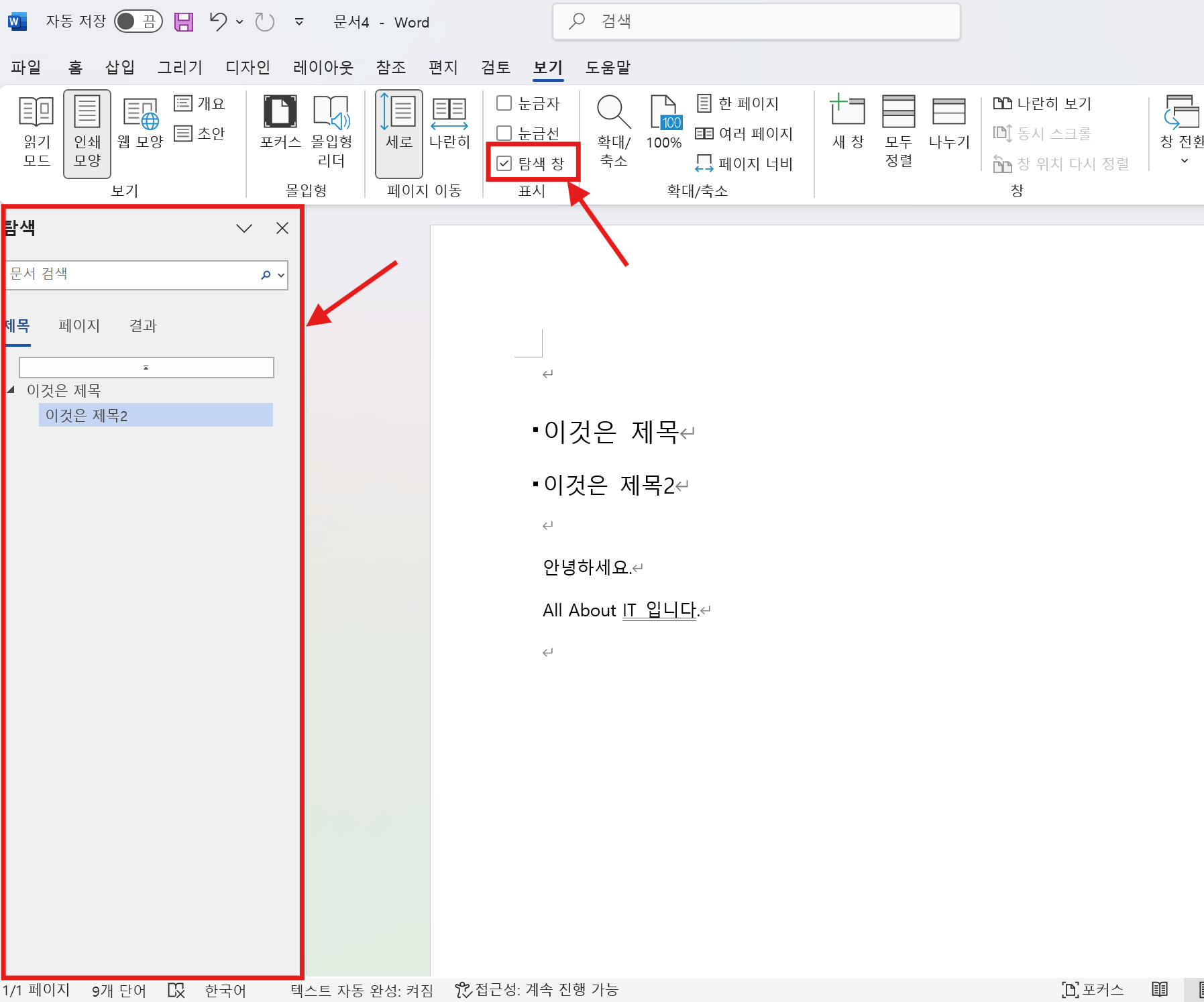 - 탐색 창 : [보기] -[표시]-[탐색 창] 체크박스 체크