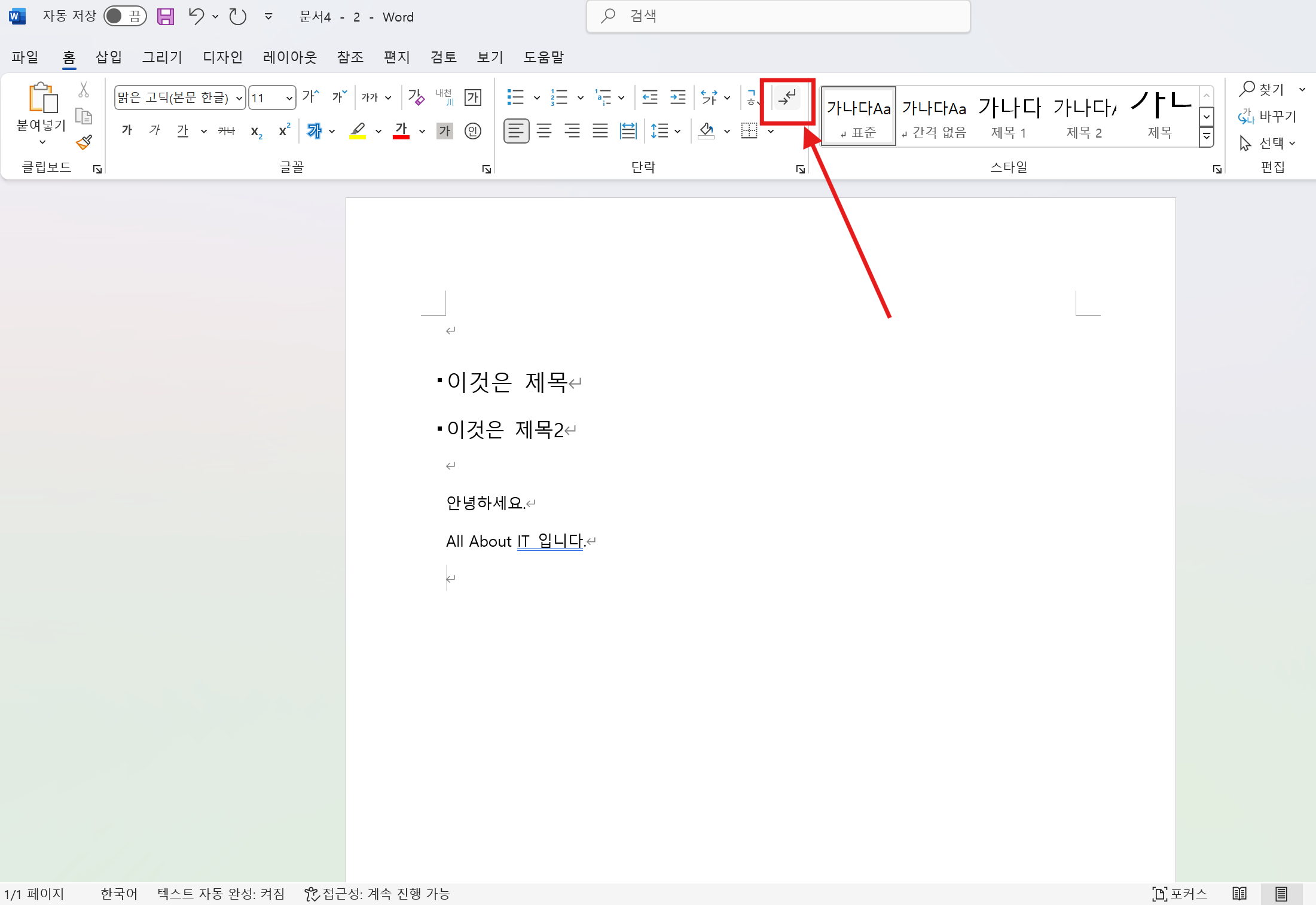- 워드 편집기호 숨기기/표시하기 단축키 : Ctrl + Shift + 8