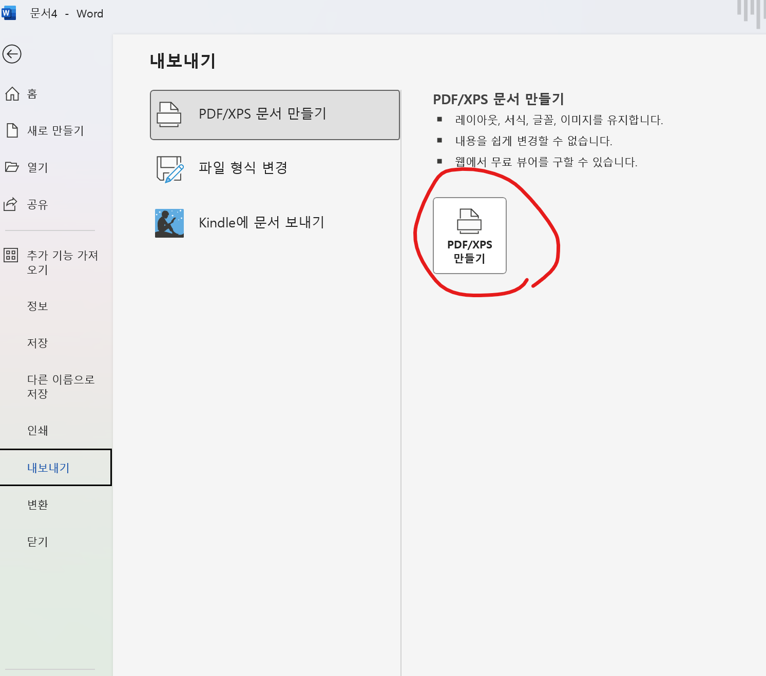 pdf로 만들거나 저장할떄는 [파일] - [내보내기] - [PDF만들기]를 이용하면 된다.