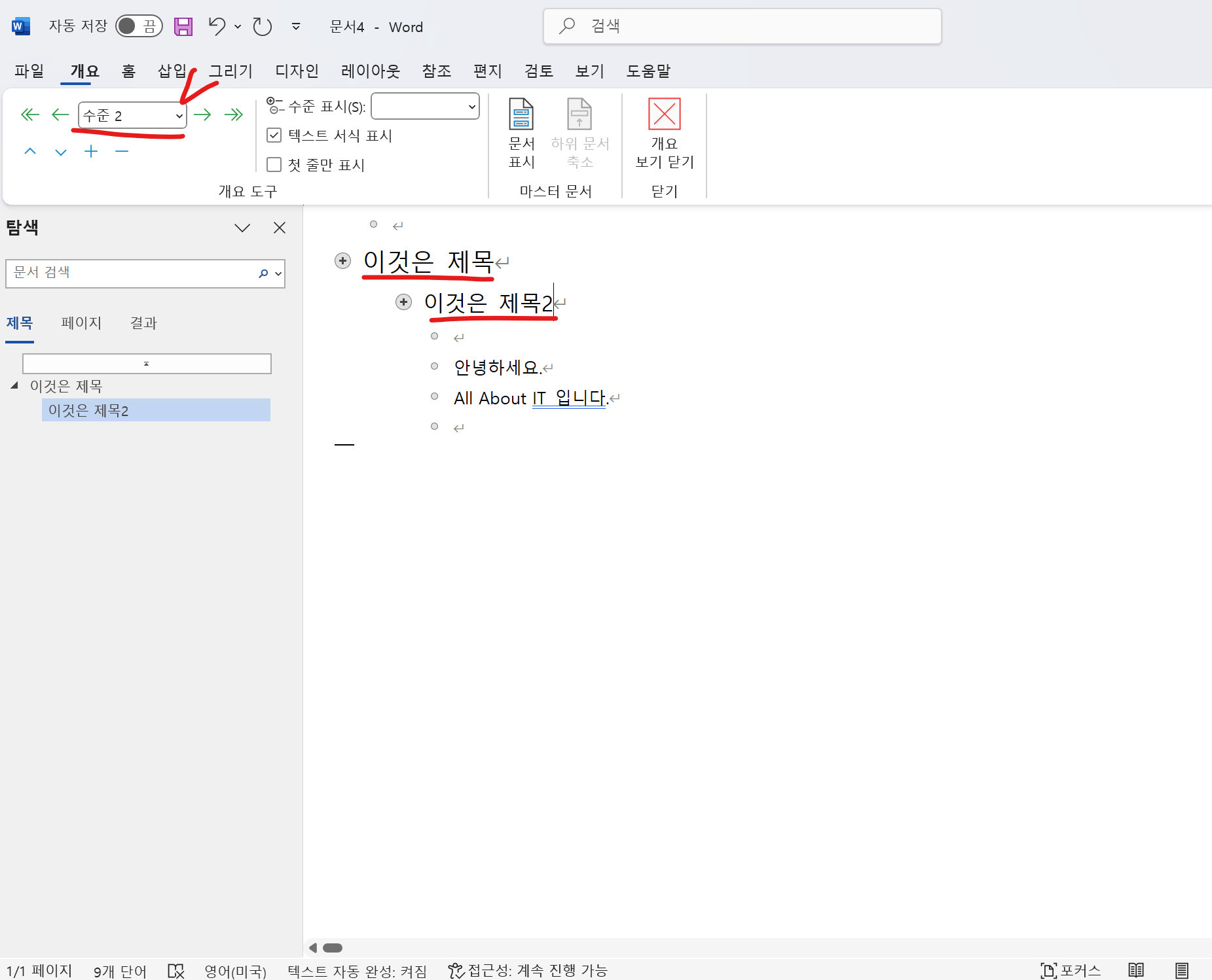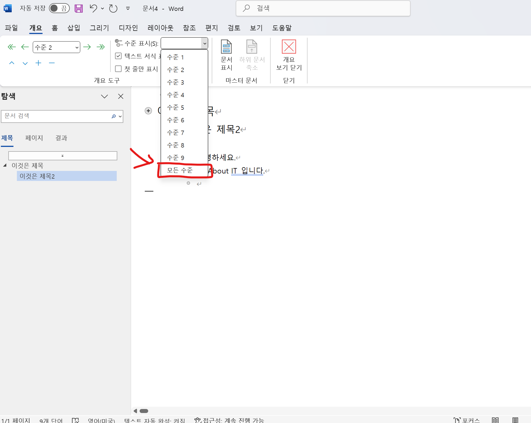 - 제목 옆 + 버튼을 더블 클릭해서 수준별로 숨기거나 노출이 가능하며 모든 수준이 보고싶다면 수준 표시에서 "모든 수준" 옵션을 선택하면 된다.