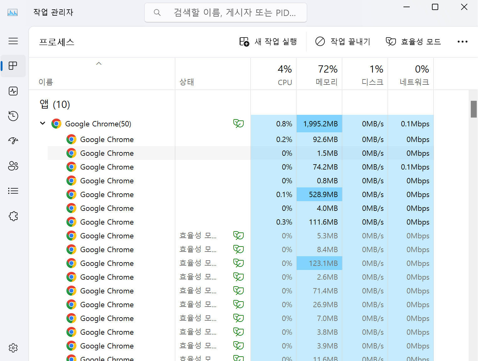 - Ctrl + Shift + Esc 키를 동시에 눌러 작업 관리자를 실행합니다.