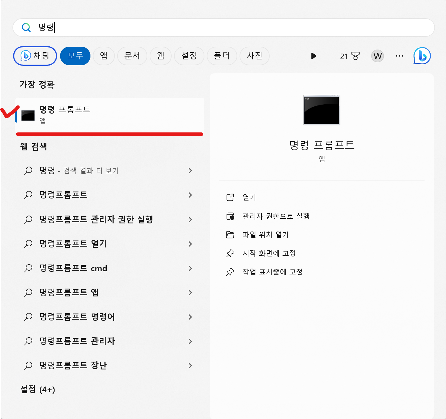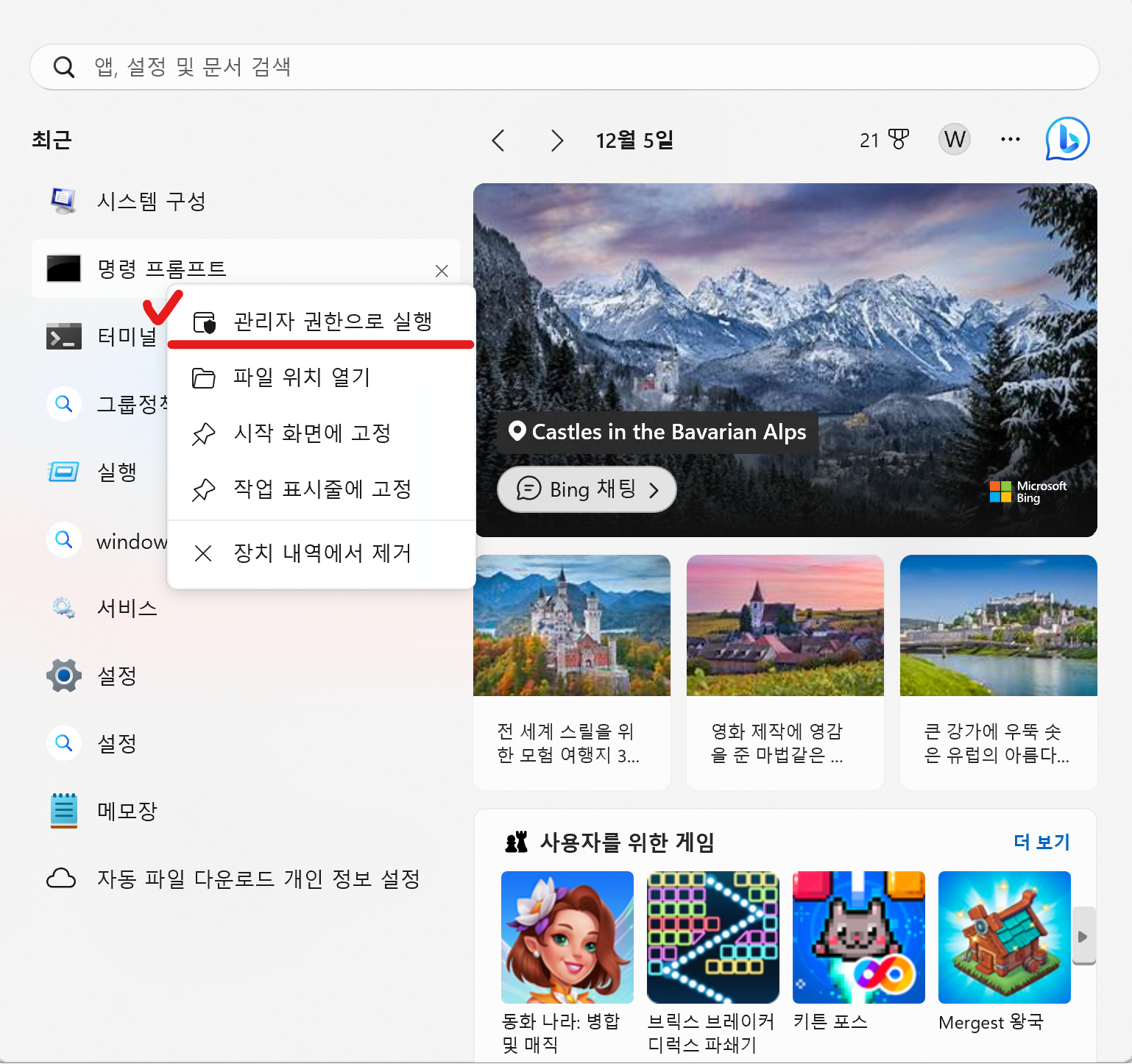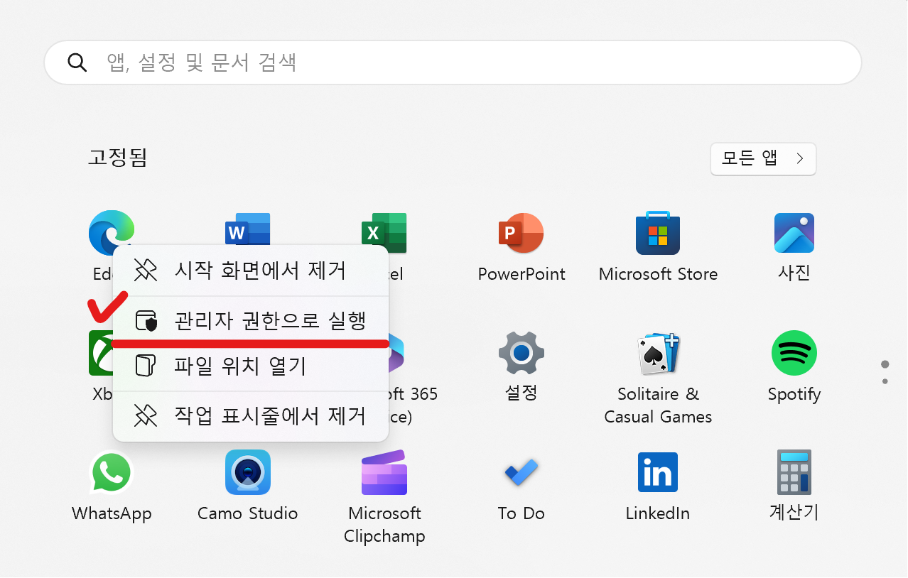 2. 시작 메뉴에서 관리자모드로 실행하기