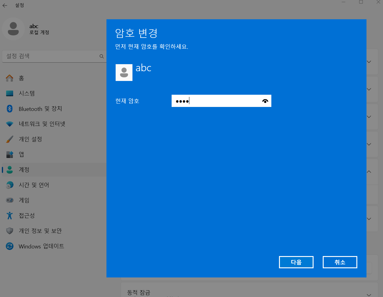 - [암호] - [변경] 을 클릭하여 현재 암호를 입력해주세요.