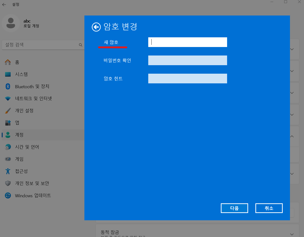 - 가장 중요한 부분은 새로운 암호를 입력하지 않고 다음 버튼을 누른 후 암호 변경을 마쳐주세요.