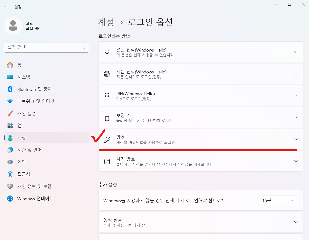 윈도우11 설정 앱에서 로그인 암호 없애는 방법