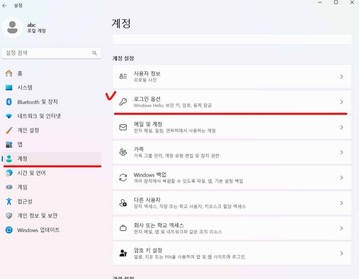 - [설정] - [계정] - [로그인 옵션] 메뉴를 클릭합니다.