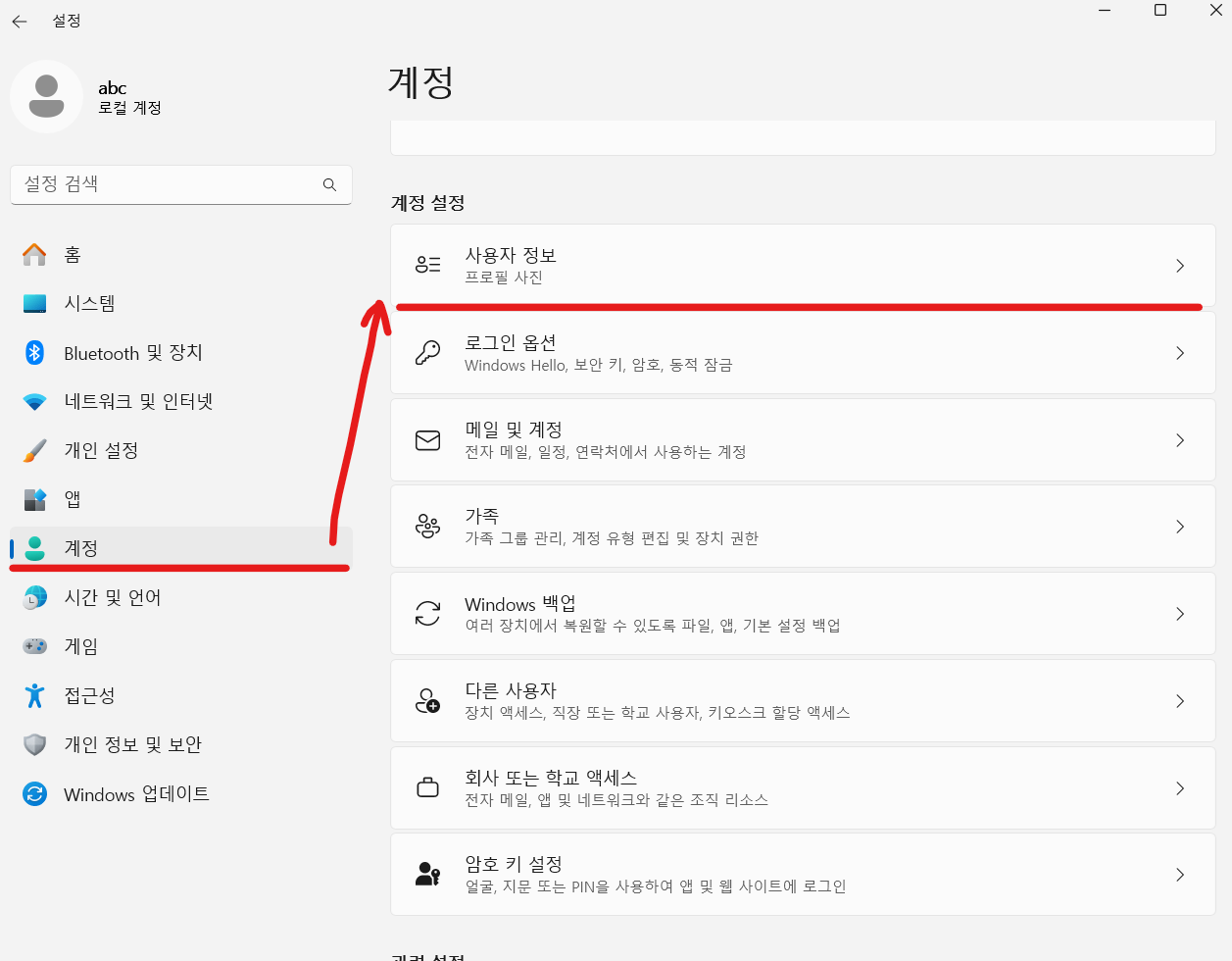 - [설정] - [계정] - [사용자 정보] 메뉴를 클릭합니다.