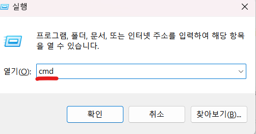 - cmd를 입력 후 터미널의 까만 화면으로 들어갑니다.