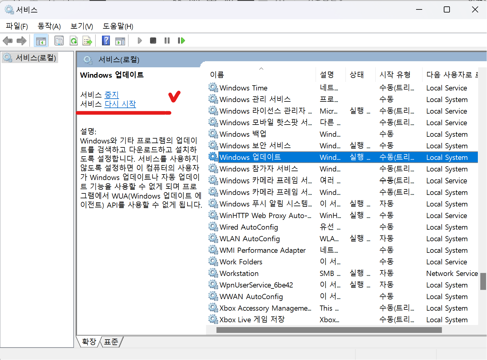 - 서비스 목록에서 'Windows 업데이트'를 찾아 클릭하세요.