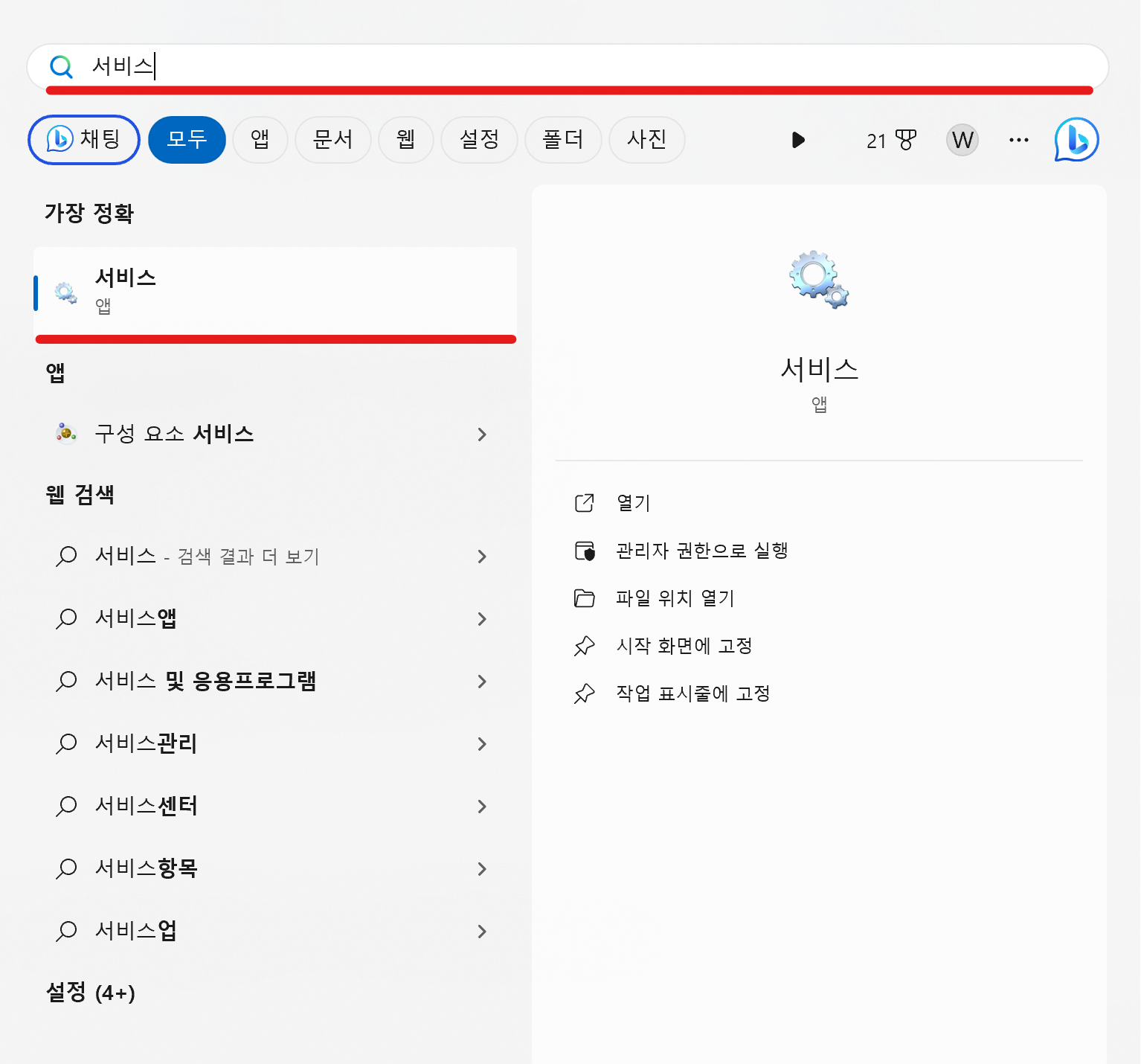 - 시작 메뉴를 클릭하고 '서비스'를 검색하여 '서비스' 앱을 실행하세요.