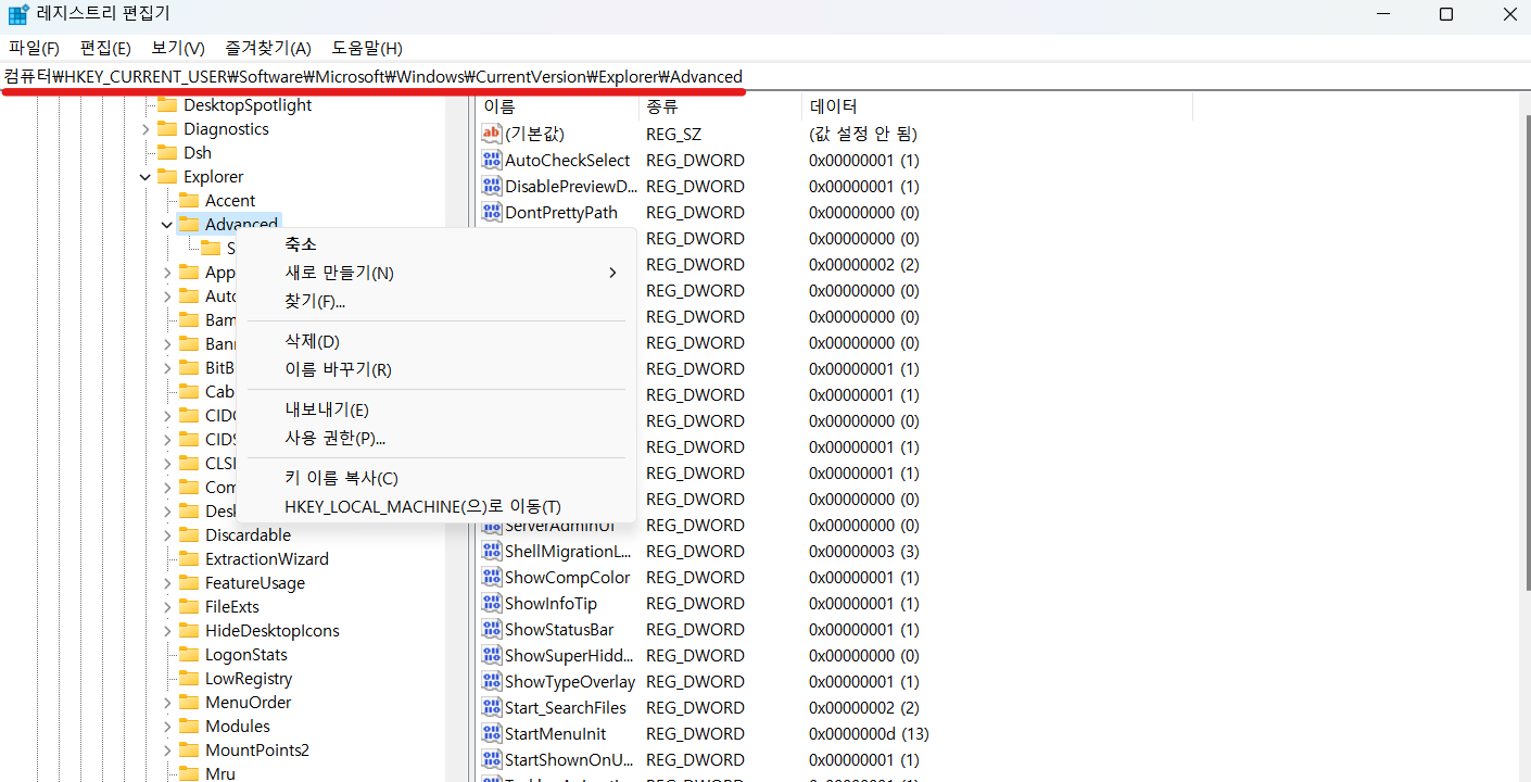 2. 컴퓨터\HKEY_CURRENT_USER\Software\Microsoft\Windows\CurrentVersion\Explorer\Advanced 의 위치로 이동해줍니다.