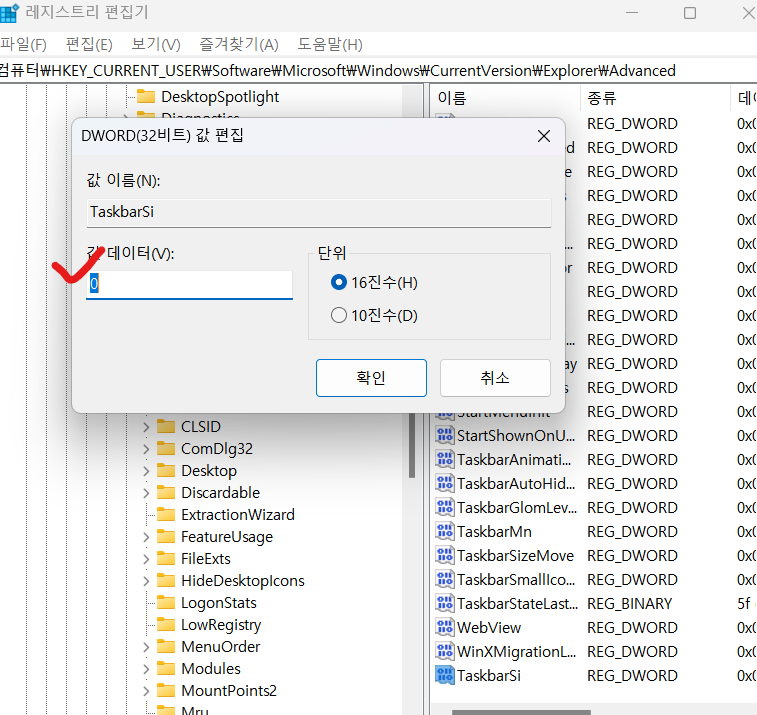 - '새로 만들기' 의 DWORD(32비트) 값(D) 를 눌러준 후 TaskbarSi 로 이름을 정해줍니다.