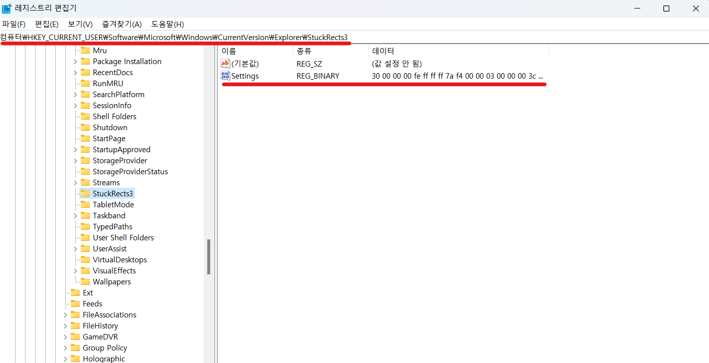 - HKEY_CURRENT_USER\Software\Microsoft\Windows\CurrentVersion\Explorer\StuckRects3 경로로 들어가서 Settings 를 클릭합니다.