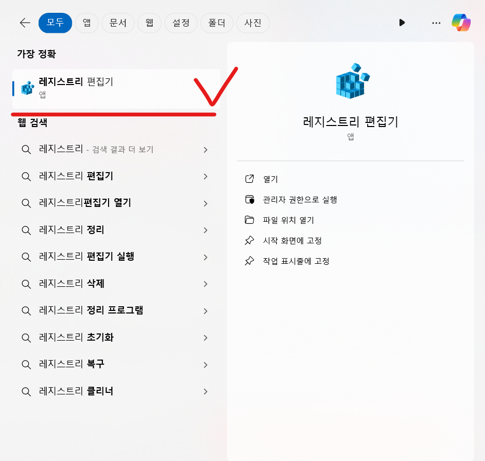 - [검색] 에서 '레지스트리 편집기'를 검색합니다.