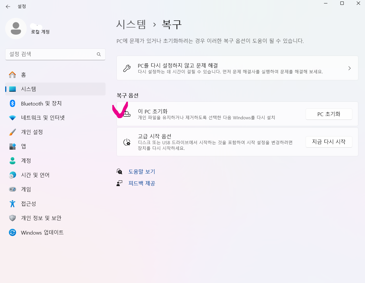 - 복구 옵션에서 '이 PC 초기화' 의 'PC초기화'버튼을 클릭합니다.