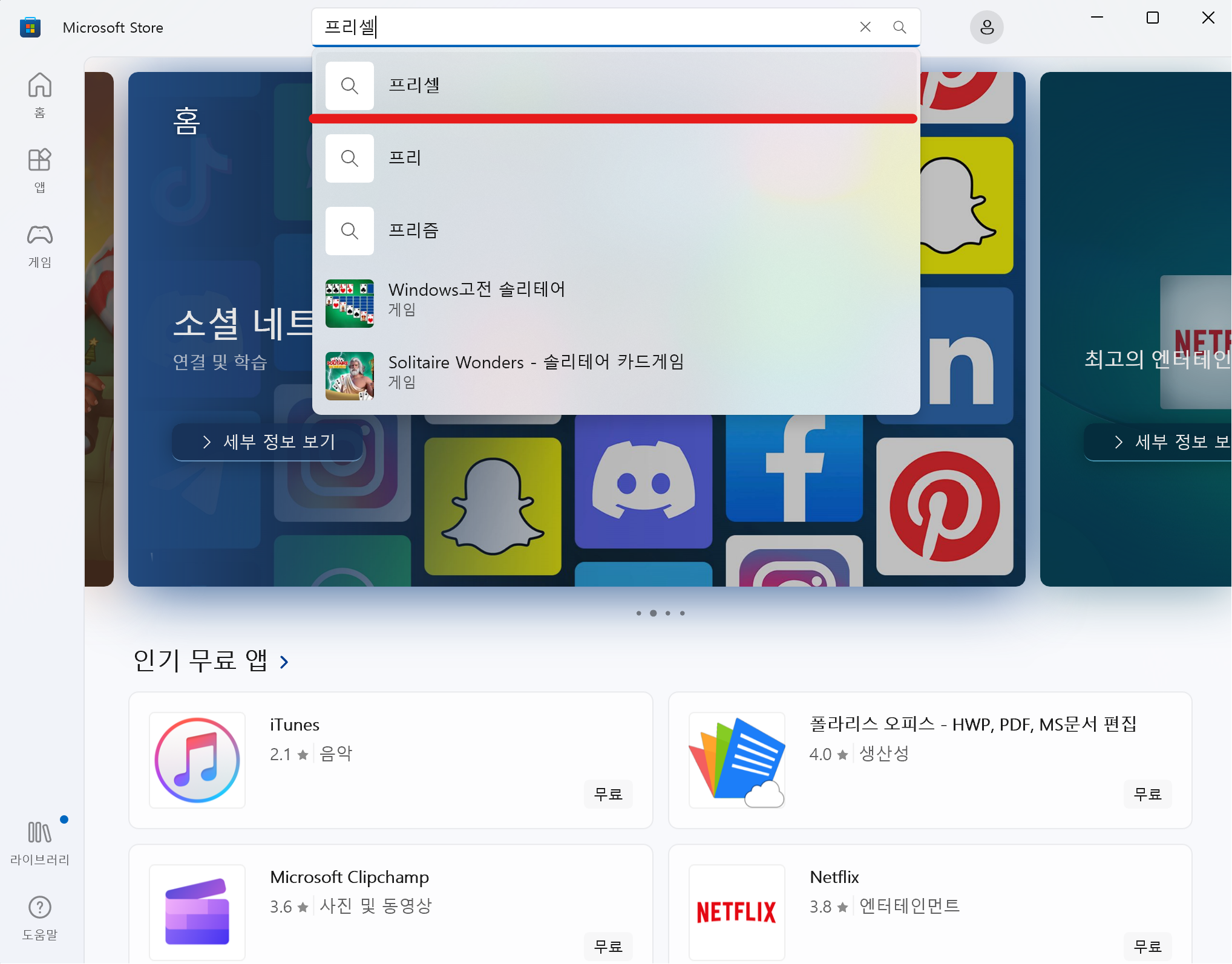 - 검색 창에 "프리셀"을 입력하고 Enter 키를 누릅니다.