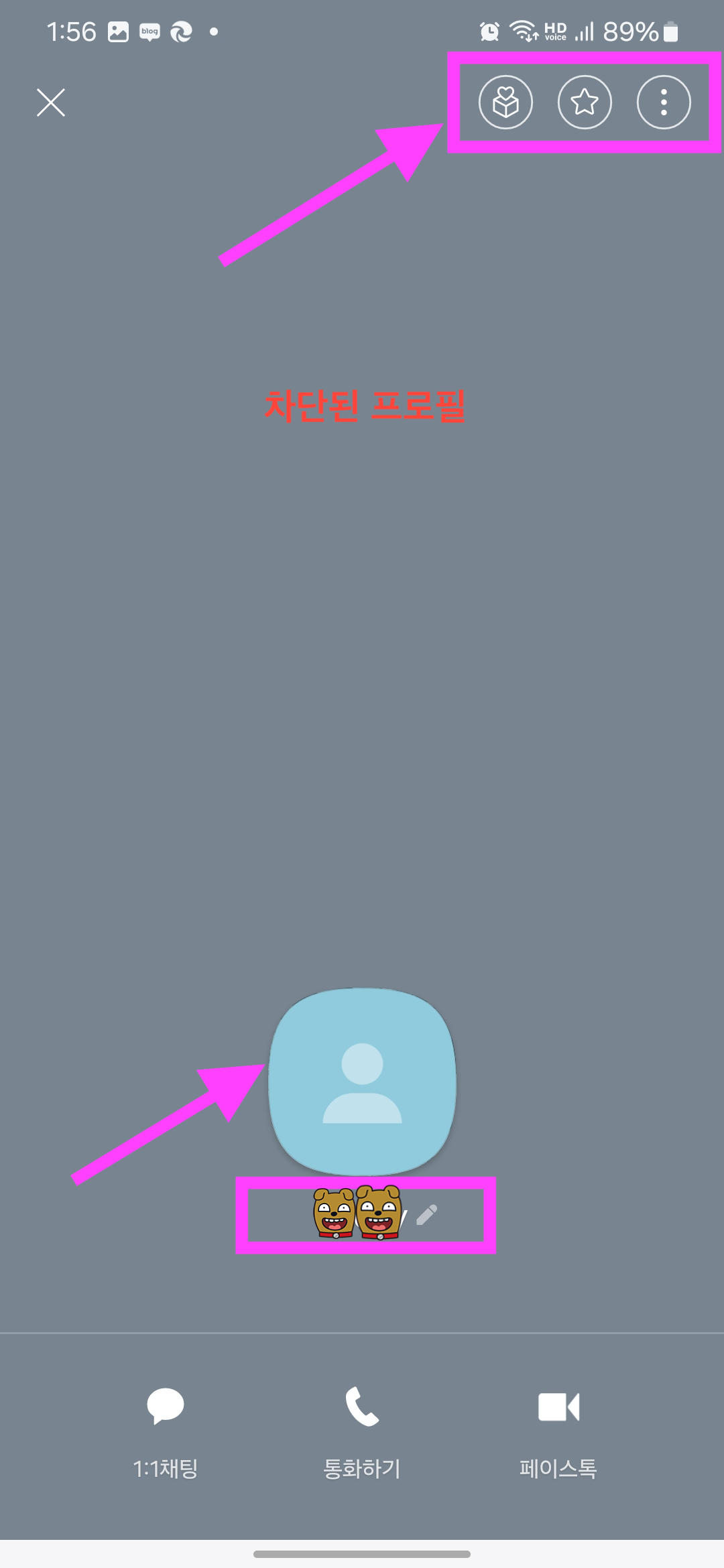 카카오톡 차단을 당하면, 상대방의 프로필이 비공개로 설정됩니다. 이 경우, 프로필 사진과 커버 이미지가 사라지고, 상단 우측의 아이콘 개수도 달라집니다.
