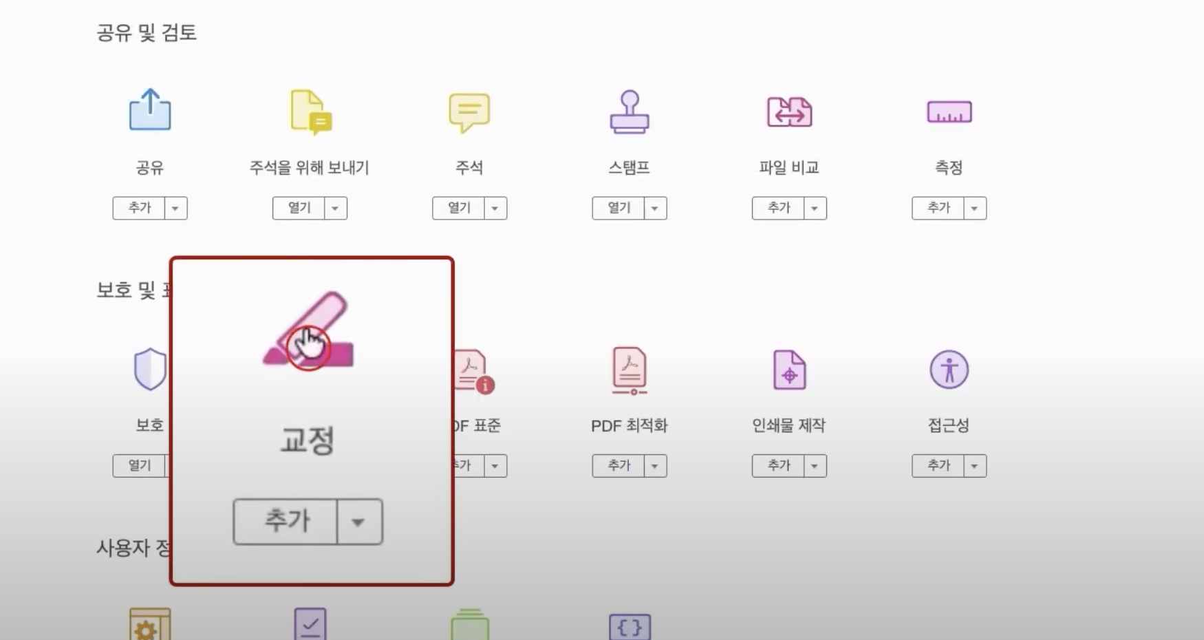 - 삭제할 PDF 파일을 선택한 후, '교정'을 클릭합니다.